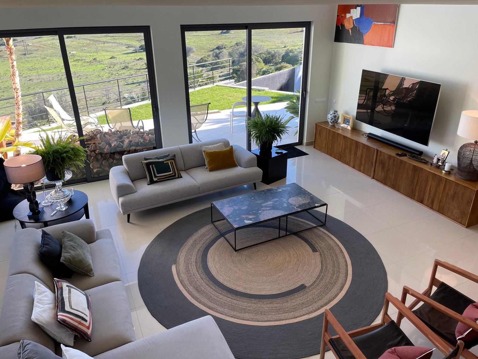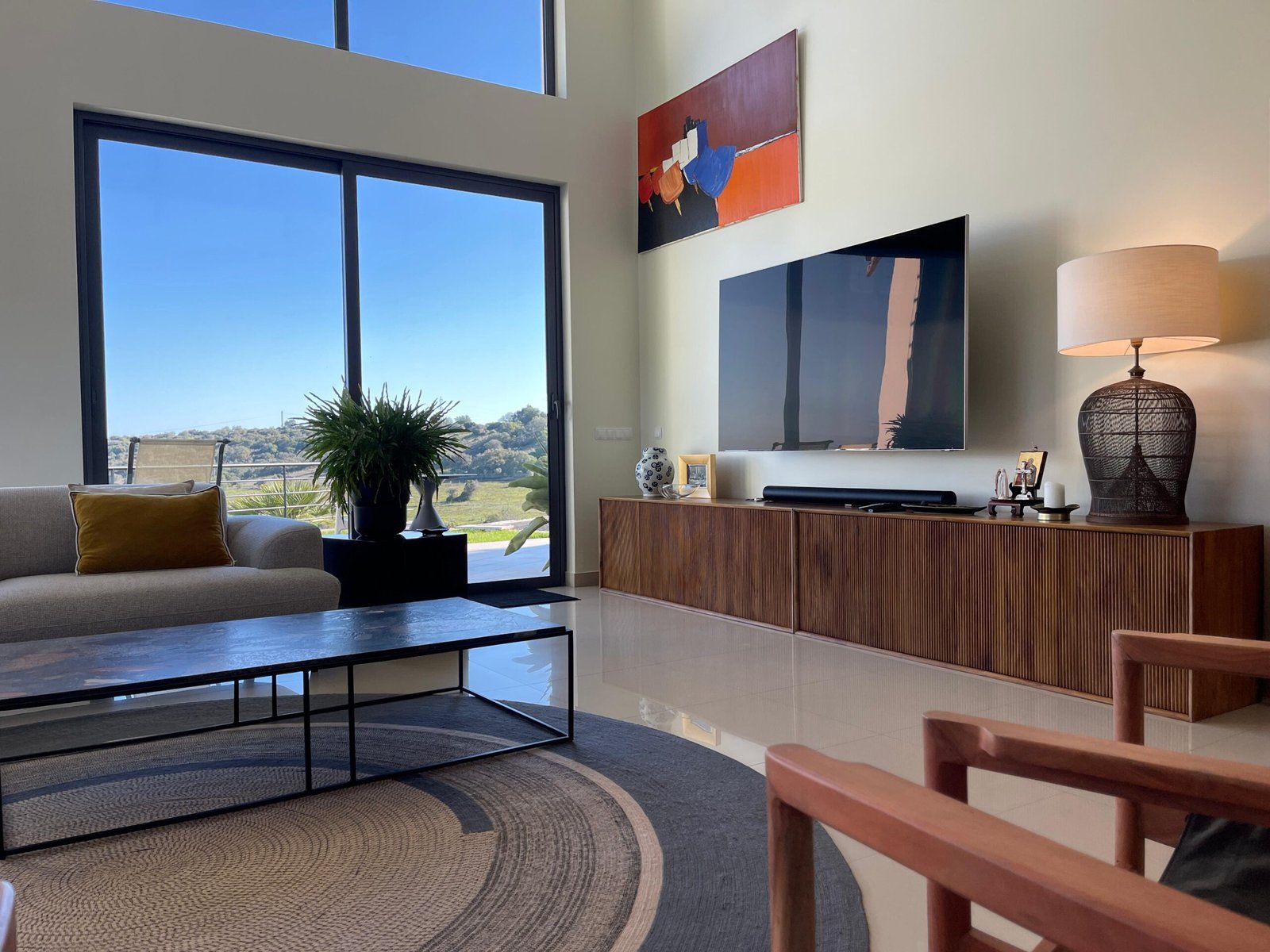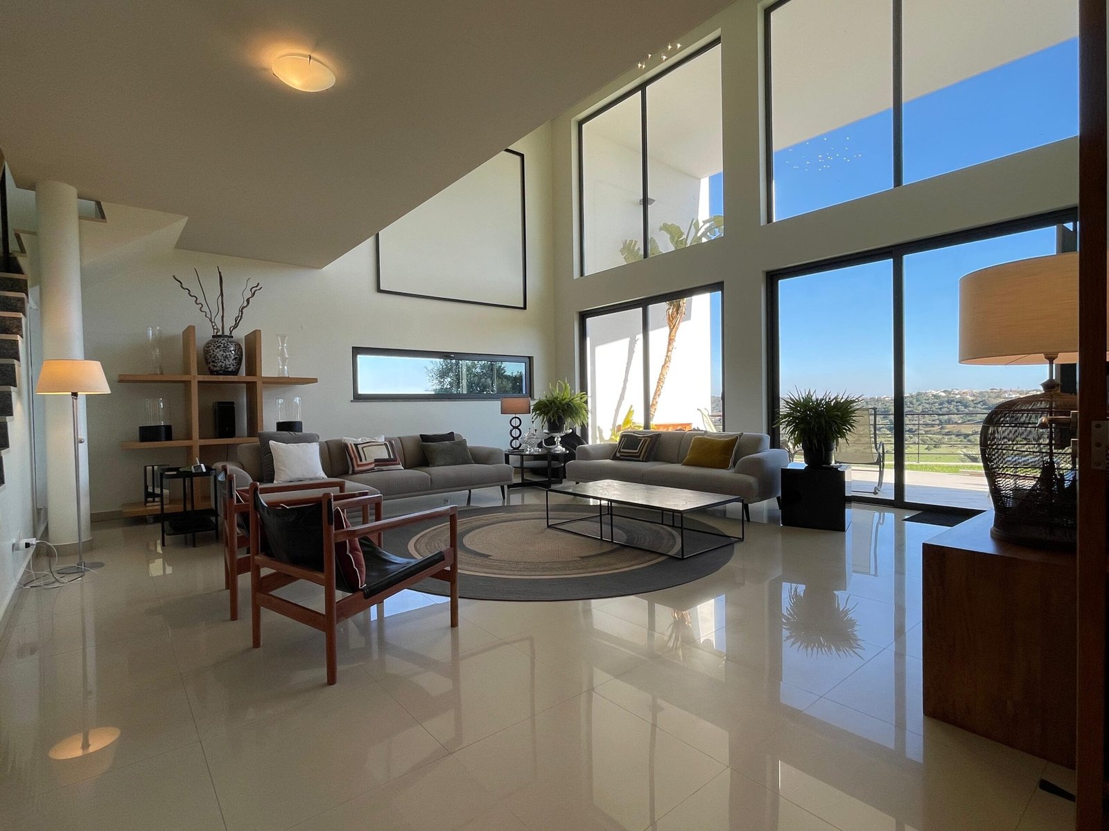 A sala principal conta com um impressionante pé-direito duplo, proporcionando uma envolvência única e vistas deslumbrantes.