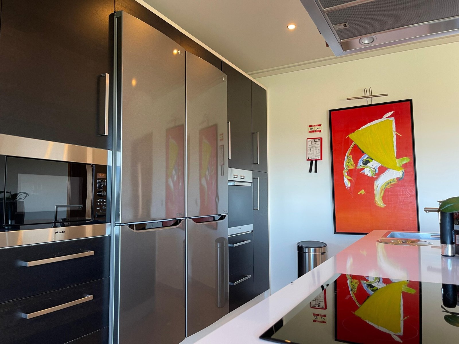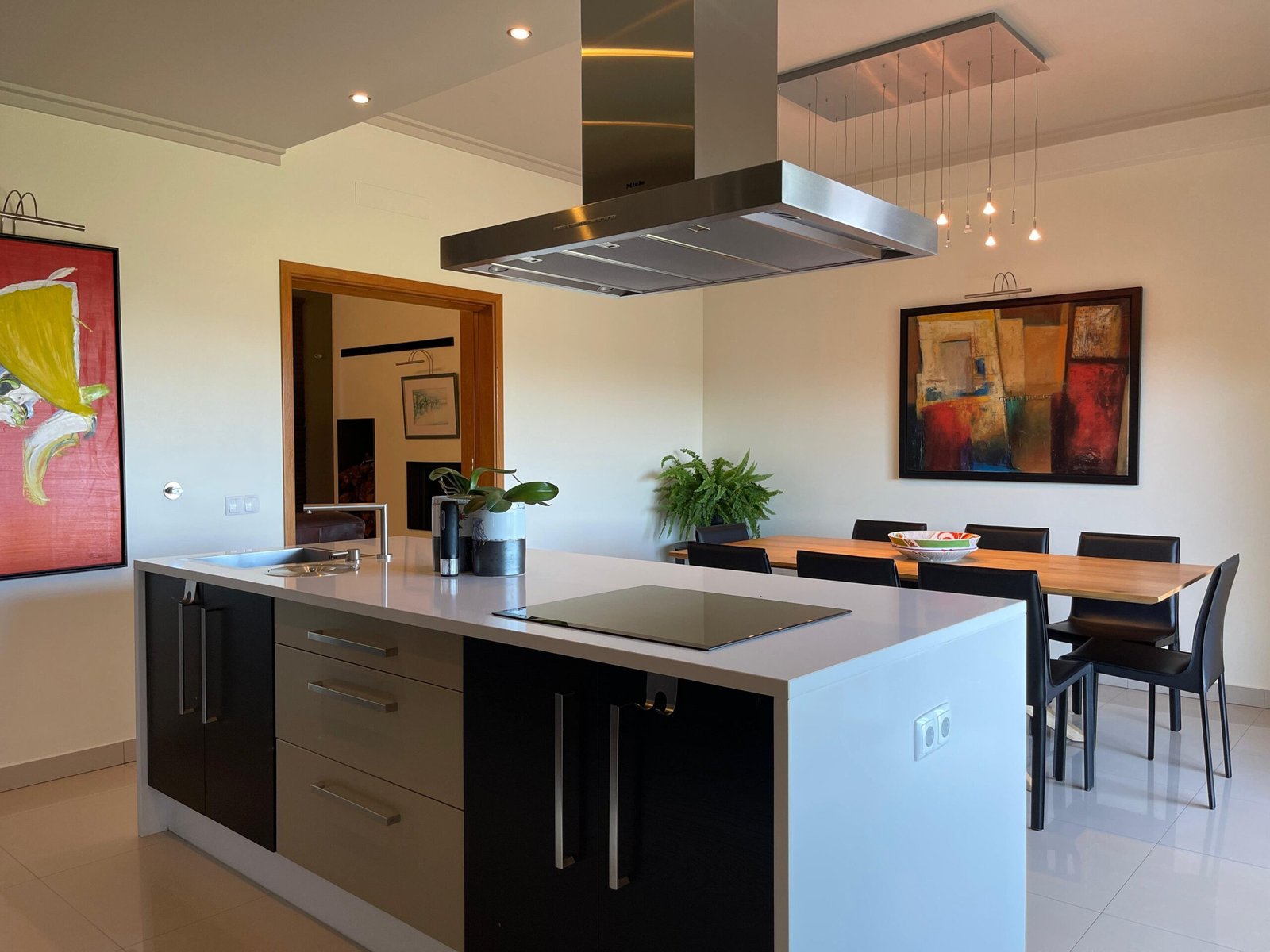 No piso térreo, destacam-se quatro suítes espaçosas, todas com roupeiros embutidos e acabamentos premium. Na sala de estar acolhedora conta com uma lareira, perfeita para momentos de descontração, uma cozinha de design contemporâneo, equipada com eletrodomésticos Miele e dividida em duas zonas distintas, incluindo uma ampla área de refeições adjacente.
